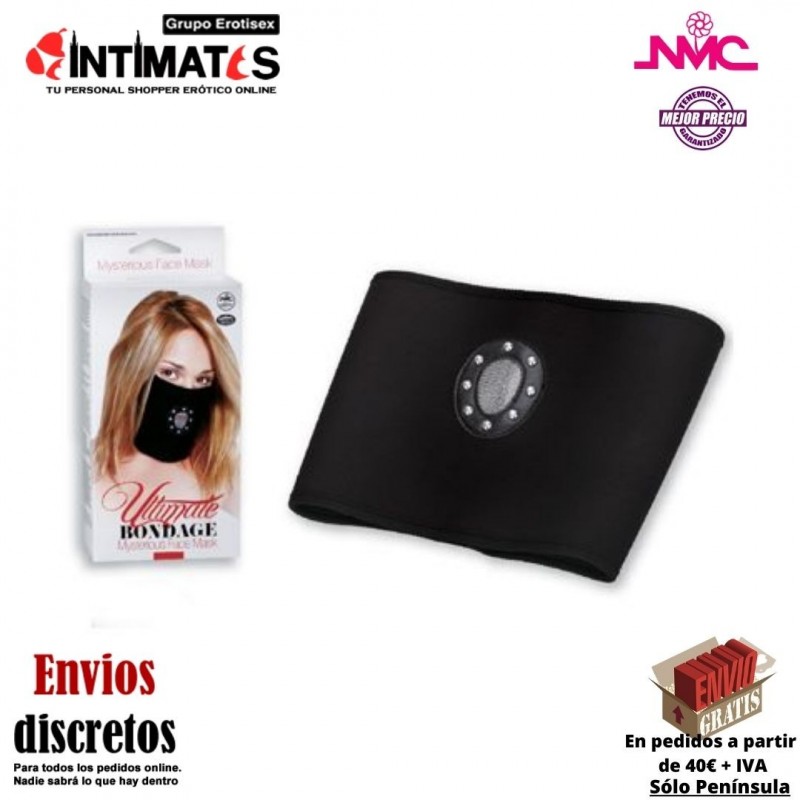 Ultimate Bondage es una suave máscara hecha de neopreno de color negro, con cierre en la parte posterior y abertura a la altura de la boca para colocar un consolador o mantener la boca al descubierto.