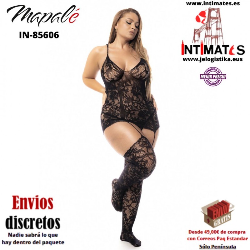 Marca tendencia con este icónico body con escote redondo de rejilla semifloral transparente , con detalle de cordones en la espalda, ligas y medias hasta el muslo con puntera integradas de Mapalé.