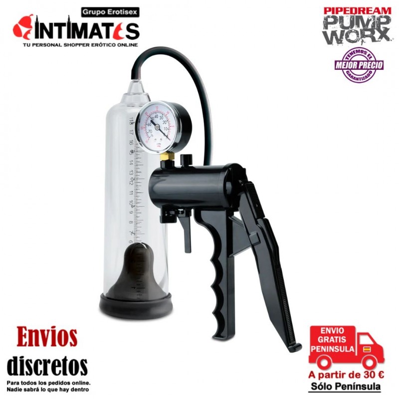 ¡Simplemente inserta tu pene en el tubo del cilindro de vacío, aprieta el mango con empuñadura de pistola y observa cómo tu barra de placer se hincha con poder!