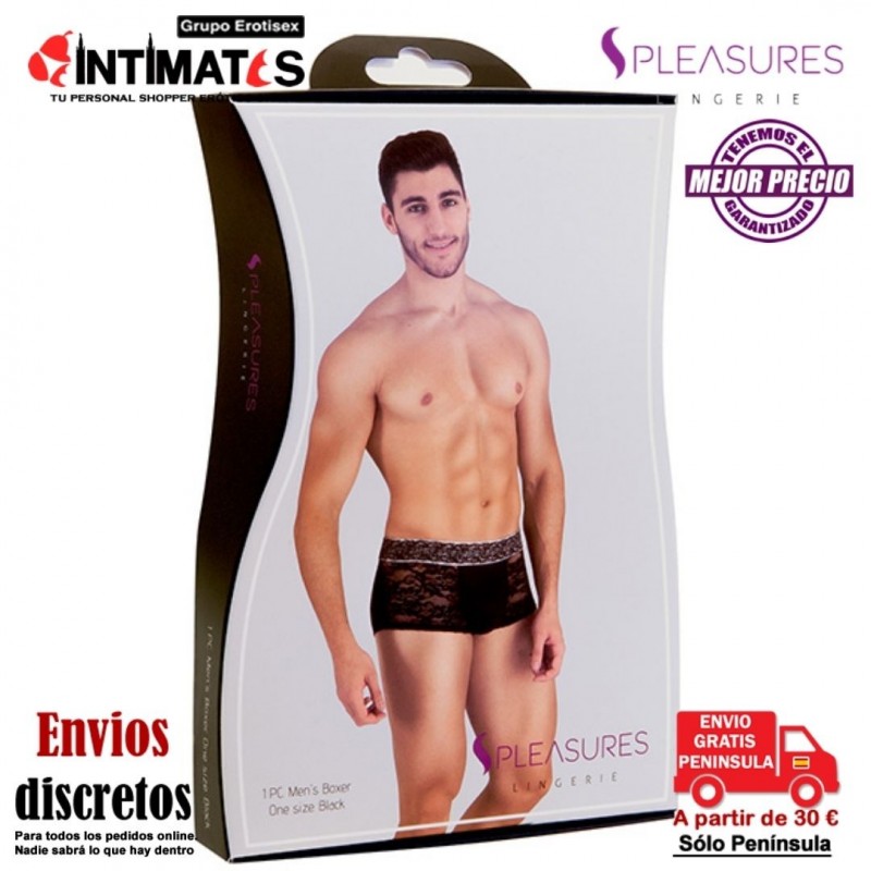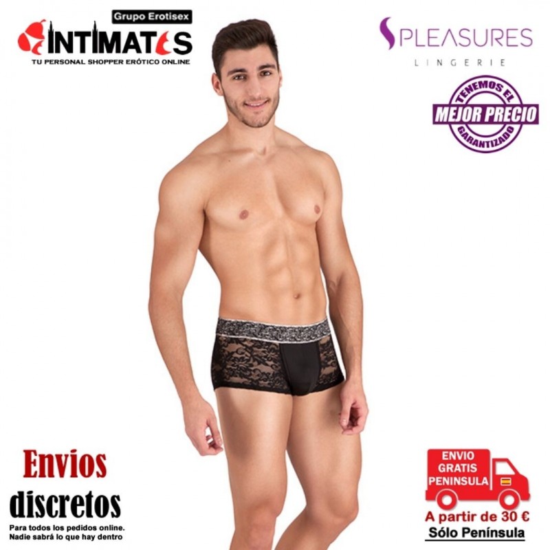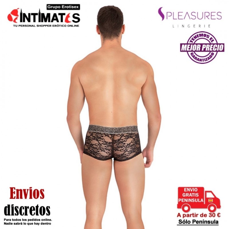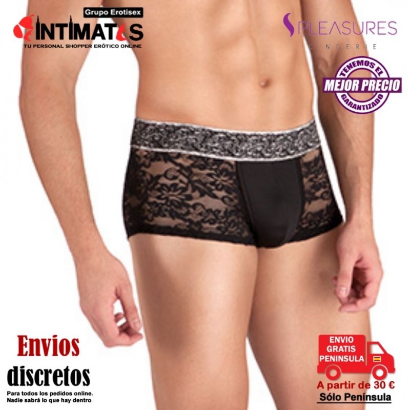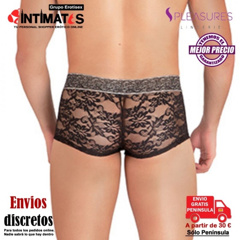 Bóxer de hombre negro confeccionado de encaje con motivos florales y cintura plateada a juego con el bóxer.