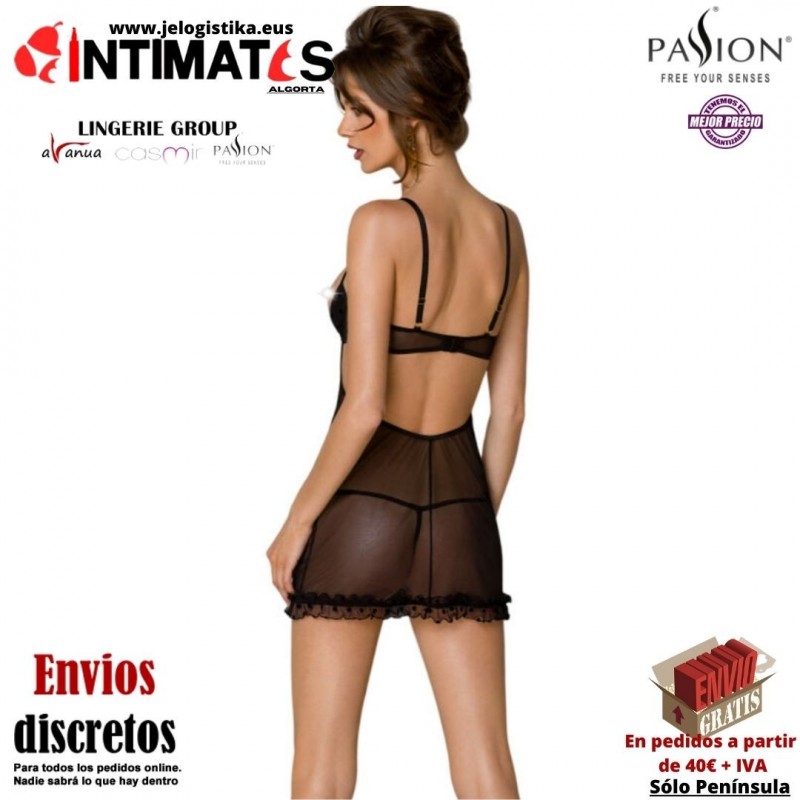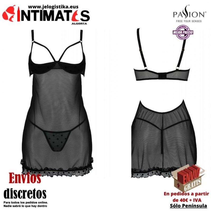 Martina es un espectacular camison de delicado tul que abrazará tu cuerpo y las copas abiertas levantarán tus senos y los expondrán frívolamente.