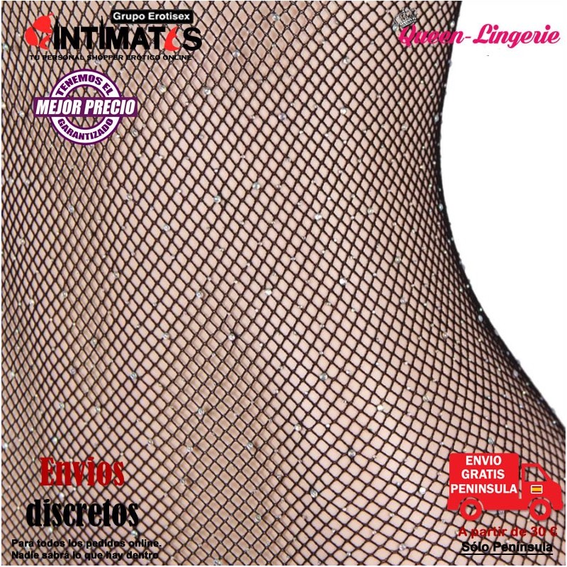 Sensual bodystocking de manga larga, de genial diseño con diseño floral con piedrecitas brillantes y abertura en la entrepierna.
