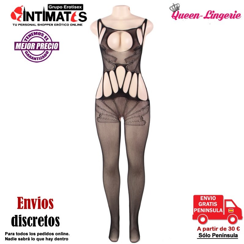 Sensual bodystocking con los hombros descubiertos y transparencias y encajes que no dan lugar a la imaginación.