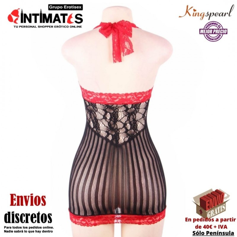 Sensual camisón de dos colores con cinta con lazo para usar como restricción y transparencias y encajes que no dan lugar a la imaginación.