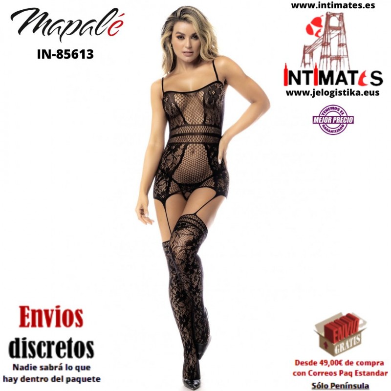 Resalta tus curvas con este diseño de malla y detalles florales, con liguero y medias integradas de Mapalé.