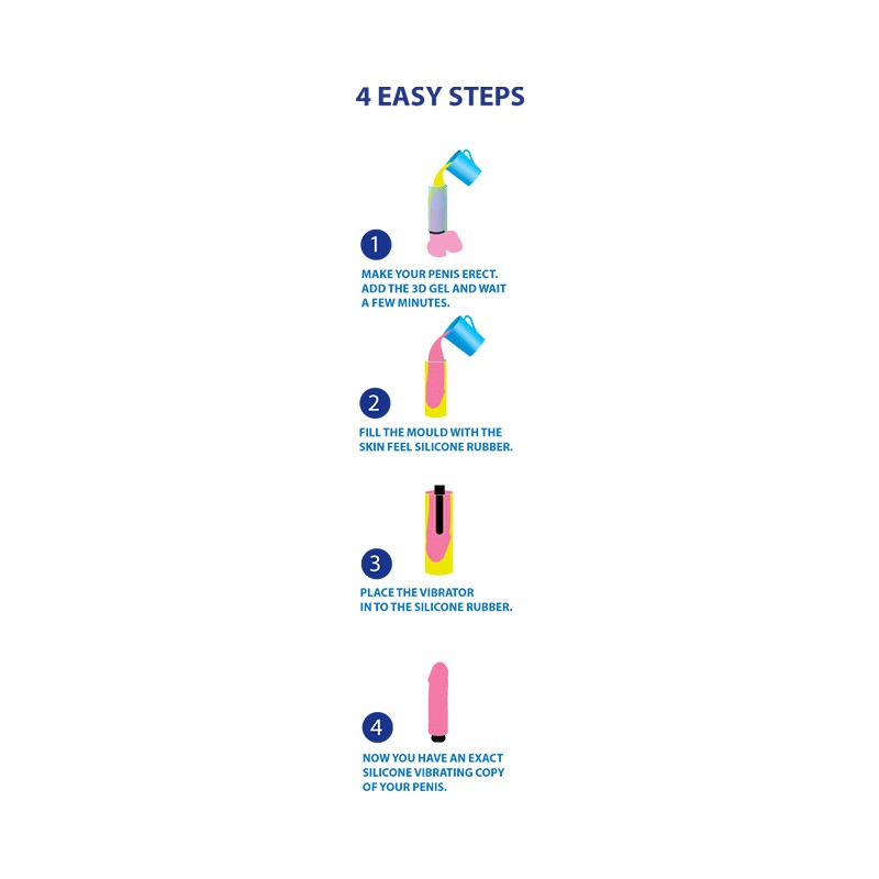Siga las instrucciones detalladas en el interior del envase. Corte el plastico y coloque la funda en una de las puntas para que sirva de cierre. Mantenga el pene en erección, a continuación coloque el anilloen la base del pene. Mezcle el gel 3D con agua. Coloque el gel sobre el pene envuelto en el envase plastico. Aguarde cerca de 3 minutos y retire el pene. Abra el envase de silicona y la revuelva, coloque en el molde. Pasados unos minutos retire y tiene una replica perfecta de su pene.