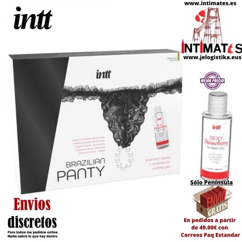 Brazilian Panty Black de intt es un sensual pack de lencería con perlas acompañado de un gel a base de agua con sabor a fresa.