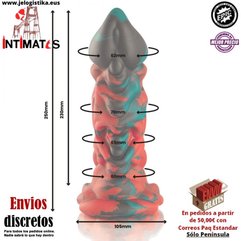 ¡Eleva tus momentos íntimos a nuevas alturas con Phobos, el dildo vibrador con control remoto de silicona de la marca Epic Cybersilicock inspirado en la mitología griega!