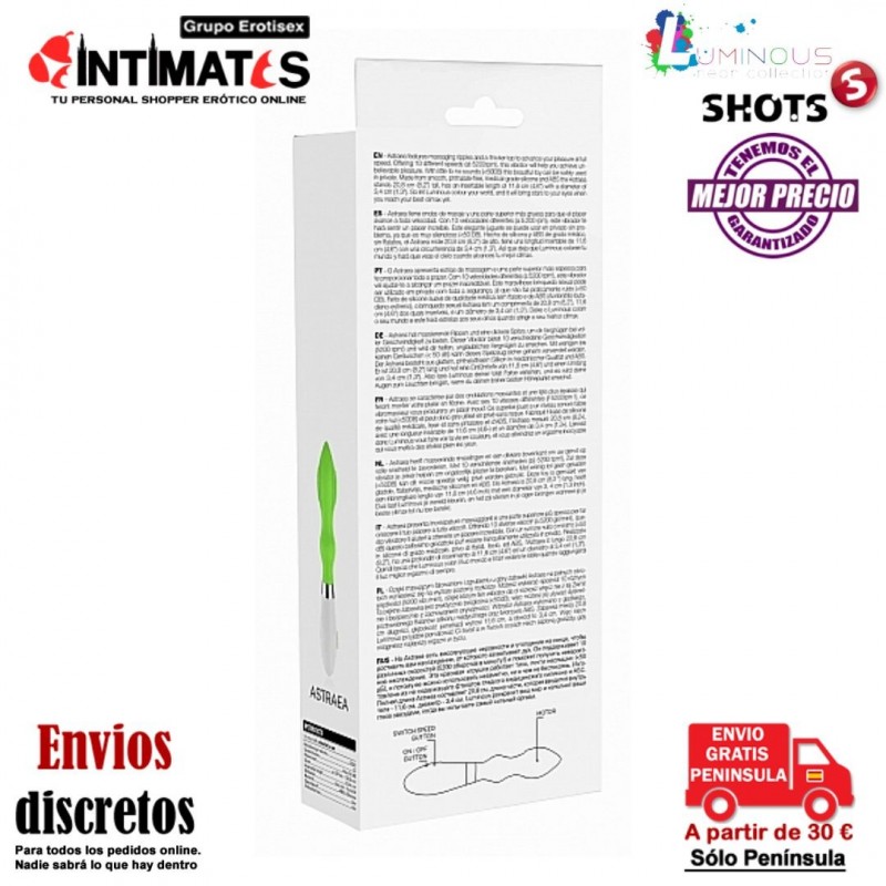 Hecho de silicona y ABS de grado médico, sin ftalatos, Astraea mide 20,8 cm de alto, tiene una longitud insertable de 11,6