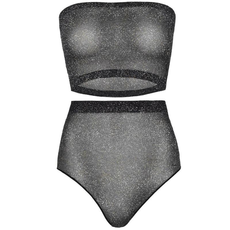 Set de dos piezas compuesto por top sin tirantas en elastano y lurex brillante y bragas brasileñas de cintura alta a juego fabricado por la prestigiosa marca de lencería Leg Avenue.
