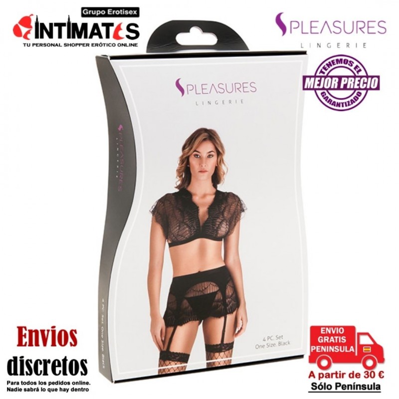 Conjunto de top, falda con liguero, tanga y medias - TU · Pleasures Lingerie