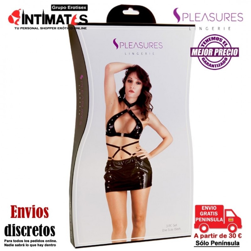 Conjunto de sostén, mini falda y tanguita de color negro · Pleasures Lingerie