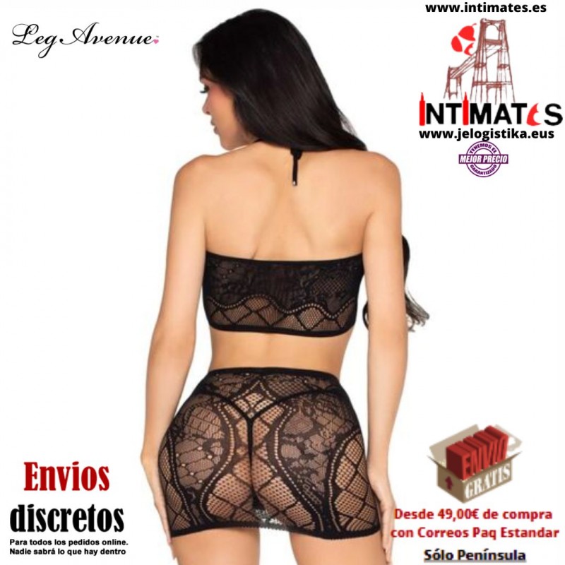 El top halter luce una delicada roseta, y la minifalda a juego seduce con su diseño traslúcido de encaje y malla.