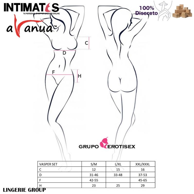 Vasper es un sexy, sensual y picante set negro que incluye sujetador, liguero y tanga.