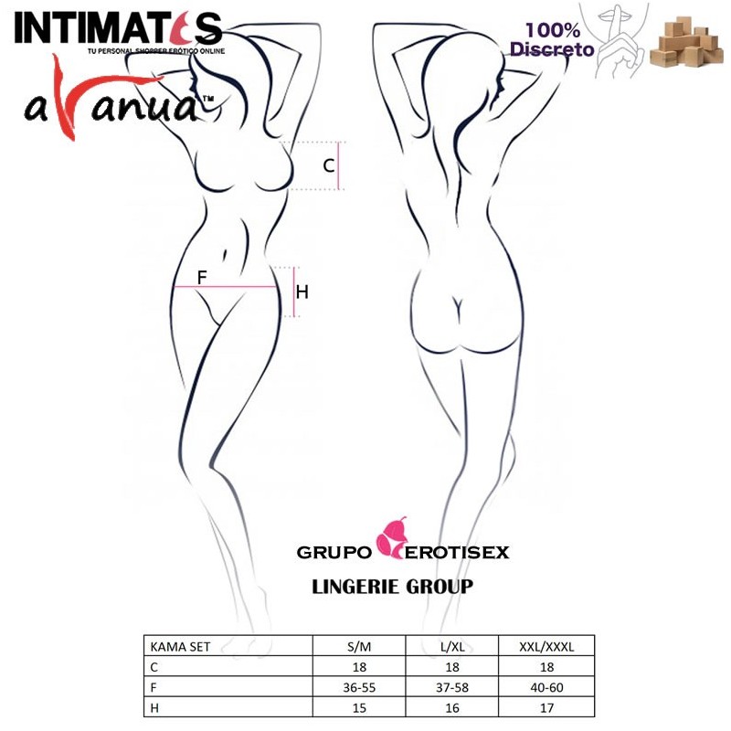 Kama es un sexy, sensual y picante set negro que incluye sujetador, liguero y tanga.
