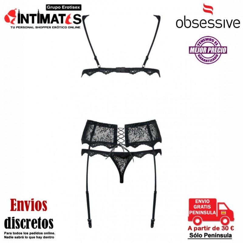 Sexy y refinado conjunto de tres piezas compuesto por sujetador de encaje, liguero caliente y tanga delicada.