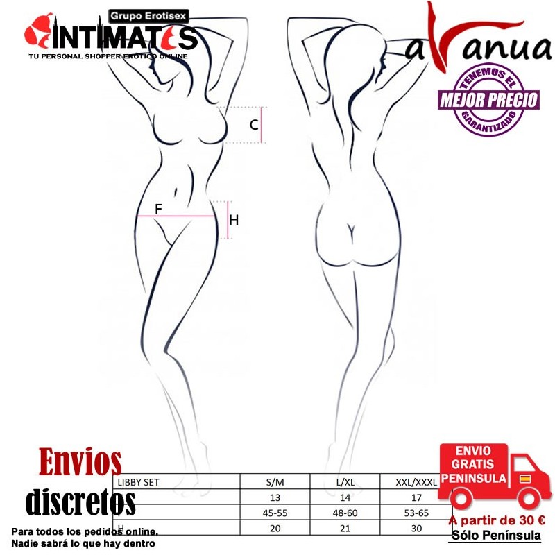 Libby es un sexy, sensual y picante set negro que incluye sujetador, liguero y tanga.