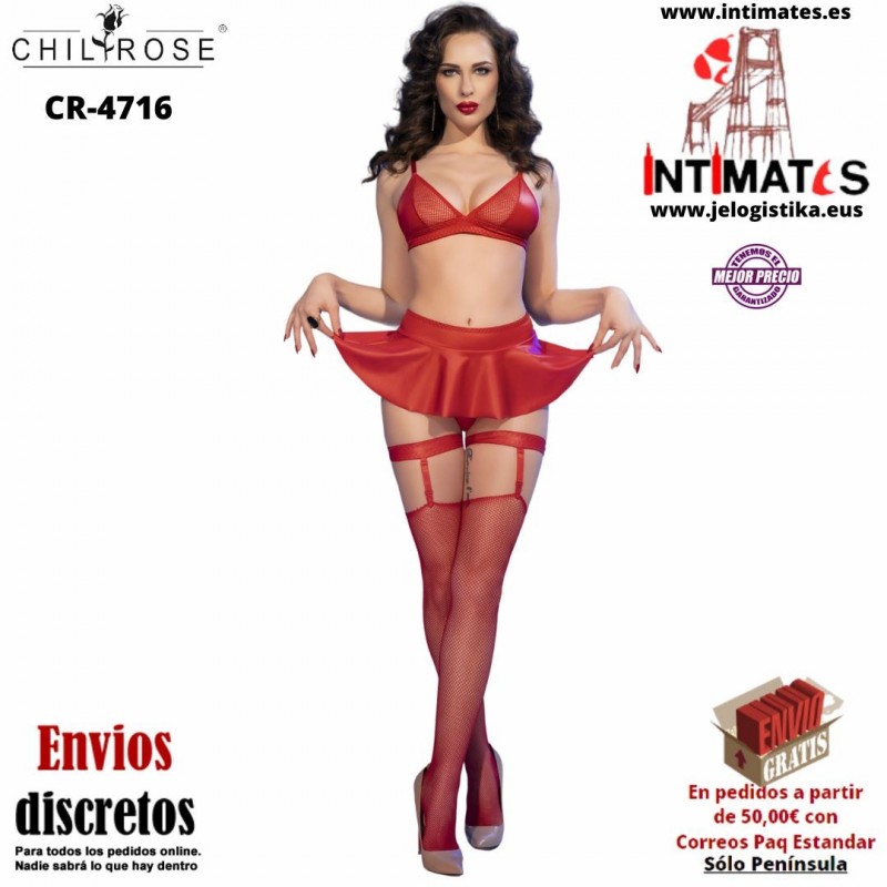 El conjunto también incluye tanga, ligueros y medias, creando un estilo completo y muy atractivo.
