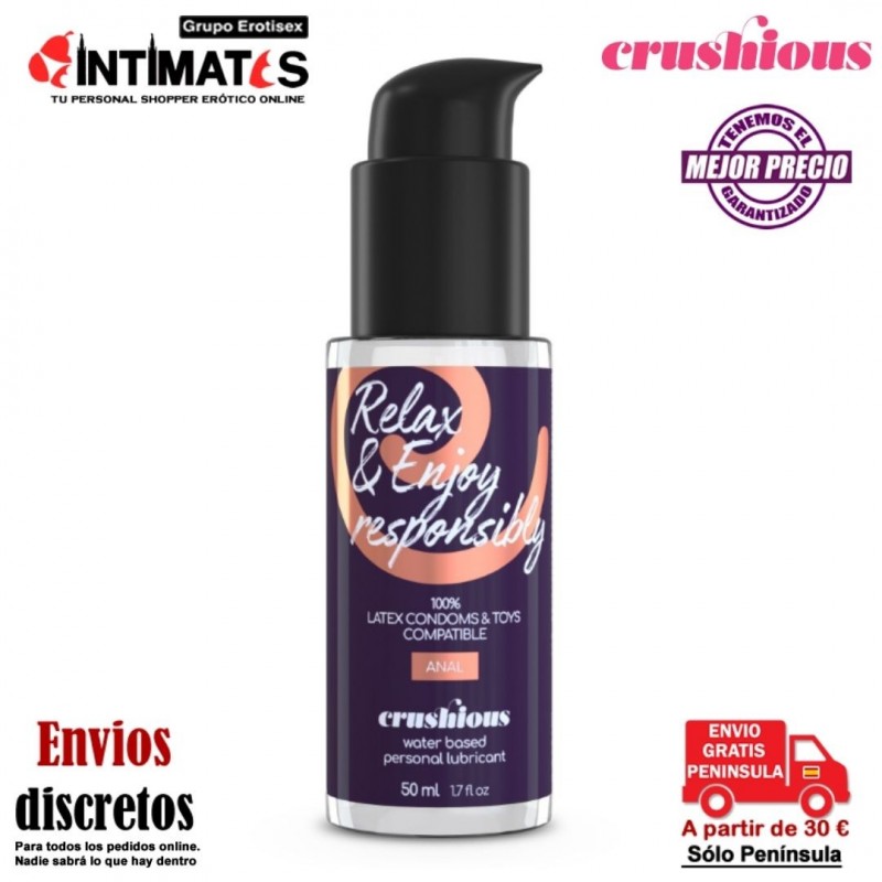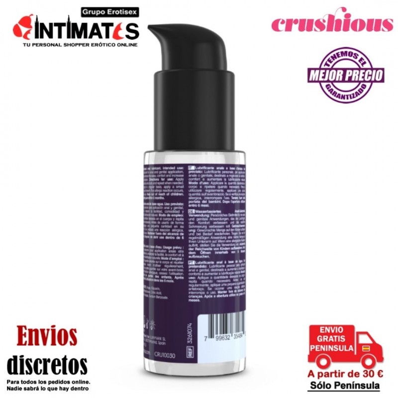El lubricante anal Crushious está fabricado en la U.E., es de base acuosa, respetuoso con la piel y no contiene anestésicos que estropeen su experiencia.
