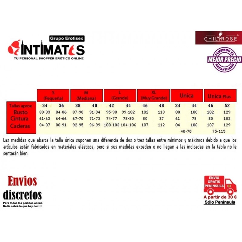 Con decoraciones metálicas en el entorno y abertura en los pechos y la zona intima.