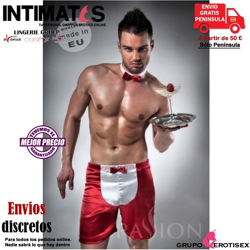 Disfraz de camarero sexy en rojo y blanco compuesto por pajarita superior y bóxer largo inferior.