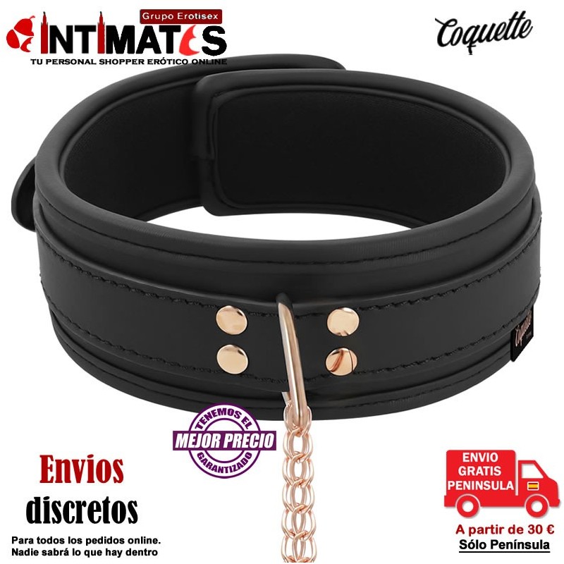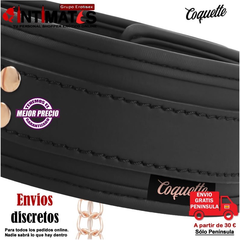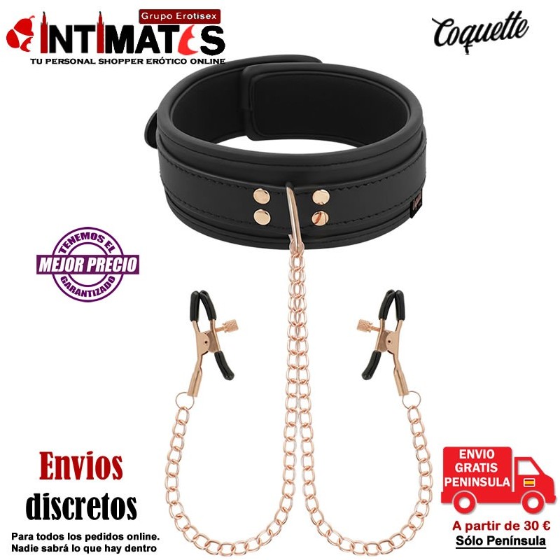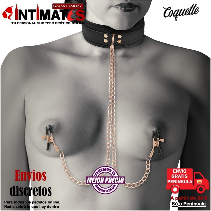 Collar de cuero vegano con pinza para los pezones unidos por cadena metálica de Coquette Fantasy.
