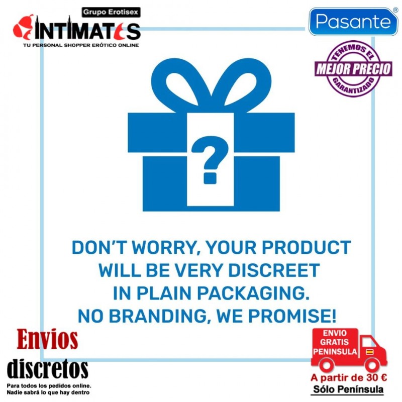 Dentro de la lámina hay un condón Pasante tamaño regular con una cabeza acampanada para un ajuste cómodo.