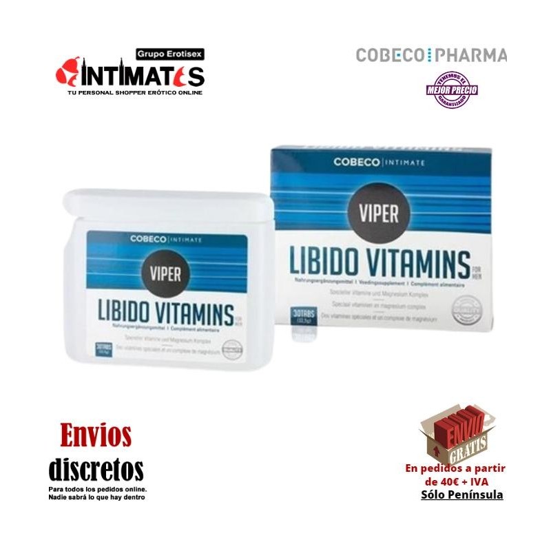 Viper Libido Vitamins de Cobeco Intimate es un complejo vitamínico con vitaminas B1, B6, B8, B12 y magnesio, que contribuye a un buen funcionamiento del sistema nervioso y al bienestar mental, además de actuar positivamente sobre la libido.
