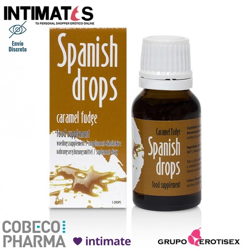 Spanish Drops Caramel Fudge es un afrodisiaco con sabor a caramelo fondente para beber directamente o poner sobre la lengua sin necesidad de utilizar una bebida azucarada.