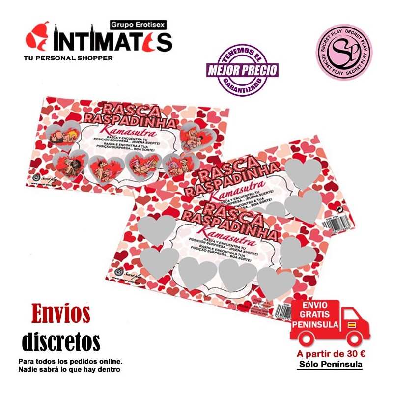 Incluye 6 corazones los cuales se rascan y aparecen posturas sexuales del kama Sutra.