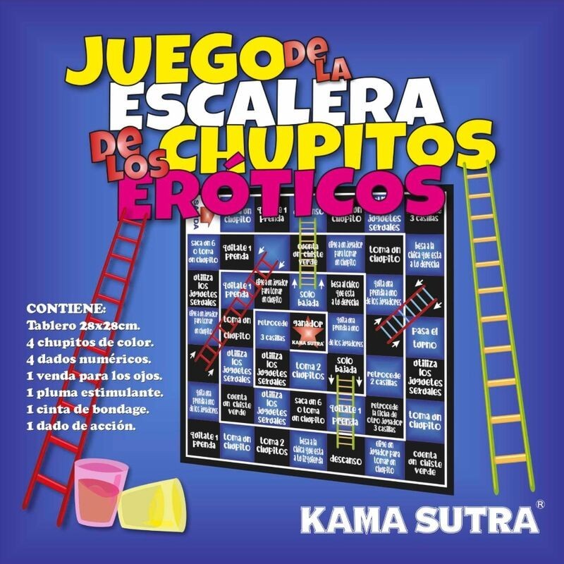 EL JUEGO DE LA ESCALERA ERÓTICA DE CHUPITOS. DIVERTIDO JUEGO PARA DISFRUTAR EN PAREJA O CON AMIGOS. En EL JUEGO DE LA ESCALERA ERÓTICA DE CHUPITOS se juega como el juego de la oca tradicional. Se va tirando el dado y avanzando tanto como éste te indique. En este juego en vez de jugar con fichas, se juega con chupitos de colores cada jugador cogera uno y habrá que llenarlo de la bebida que se hable entre los jugadores. En cada casilla tiene un prueba para quien caiga en ella y si alguien se niega a realizarla deberá pagar con una prenda y si caen en una casilla de chupito a beberse el chupito. El jugador ganador será el que llegue al numero 49. También tiene prueba de JUGUETES EROTICOS que habrá de hacerlas.