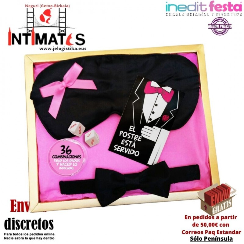 El postre esta servido, es un pack diseñado para ofrecer más placer a los dos, y que contiene un antifaz, juego de dados con 36 combinaciones y una pajarita para el pene.