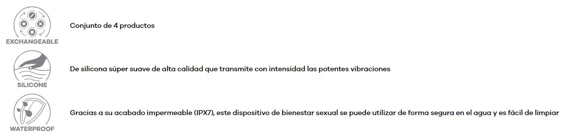 Los juguetes de silicona son intercambiables y se pueden colocar fácilmente en la base con un movimiento de clic y rotación de 90°.