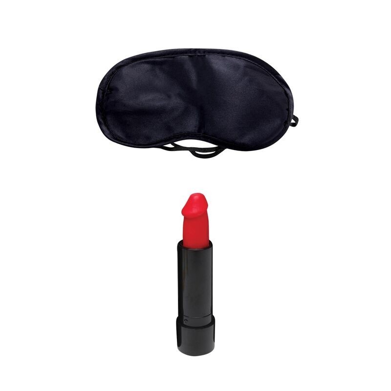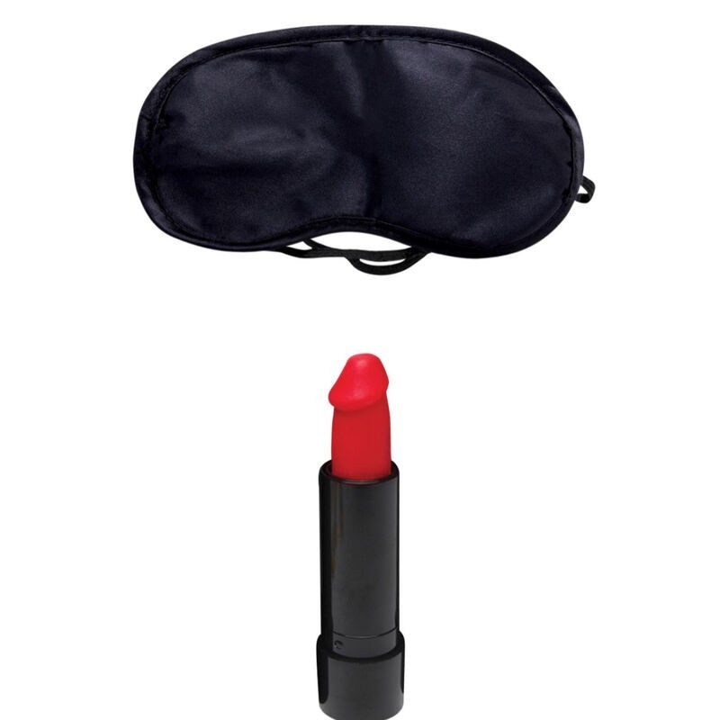 Juego de "Besa mi....!" compuesto por un póster con hombretón, un pintalabios con forma de pene y una máscara.