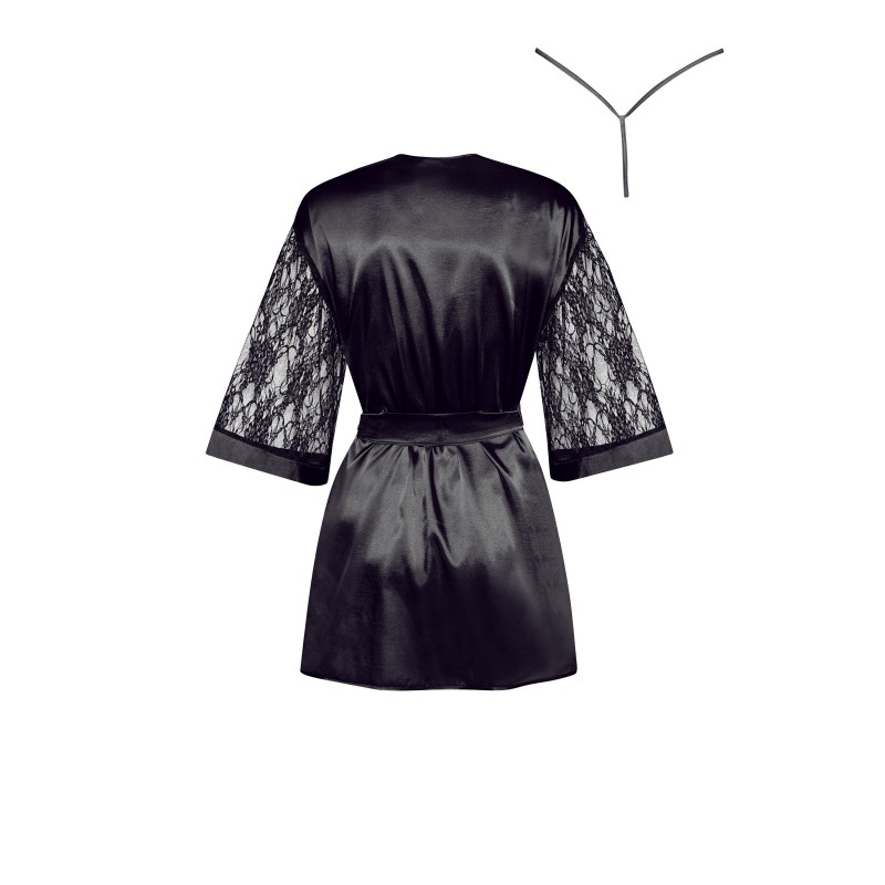 Diseño: elegante, con un clásico color negro que le confiere encanto y elegancia. Está confeccionado con materiales de alta calidad, como el suave satén, agradable al tacto. Las inserciones de encaje le dan un aspecto delicado y sensual. El lazo en la cintura permite un ajuste perfecto. Mangas largas adornadas con discreto encaje y tanga a juego.