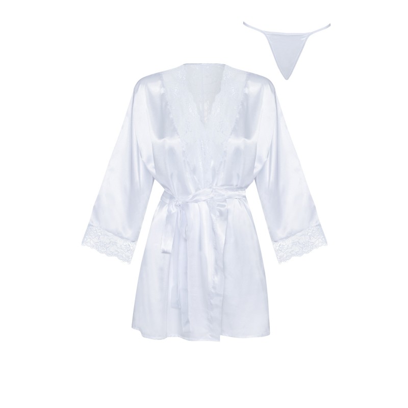 Elegante, cómoda y sexy bata de color blanco, confeccionada en satén y encaje. La bata tiene mangas largas ribeteadas con encaje. Regálate un toque de lujo!