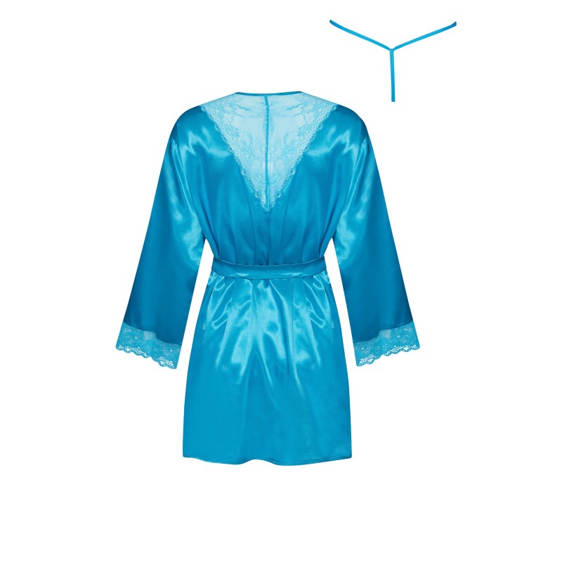 Elegante, cómoda y sexy bata turquesa de satén y encaje. La bata tiene mangas largas ribeteadas con encaje. ¡Regálate un toque de lujo!