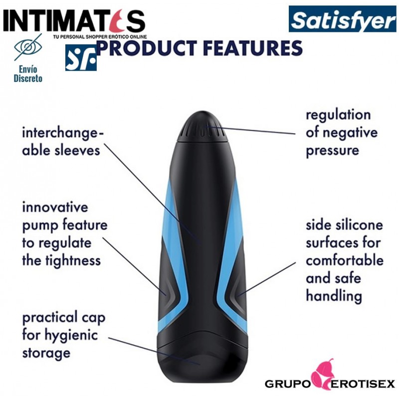 La innovadora función de bomba te permite introducir o extraer el aire durante el uso con solo pulsar un botón para ajustar por ti mismo la estrechez del Satisfyer Men One.