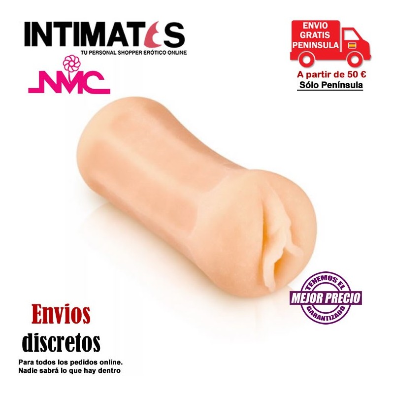 Este mini masturbador con forma de vagina del color de la piel tiene labios pronunciados y un clítoris.