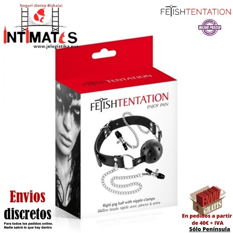 Mordaza de bola rígida negra con pinzas para pezones · Fetish Tentation