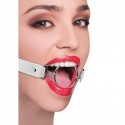 Mordaza compuesta por una anilla de acero con cuatro "brazos" curvados que salen de la anilla, que previenen que la boca se pueda cerrar. Muy similar a la mordaza de anillo, con la diferencia que alrededor de esta sobresalen ganchos para poder cambiar de posición del anillo, una vez colocado. Esta mordaza dejará a tu amante con la boca bien abierta y dispuest@ a albergar cualquier cosa que desees introducir.