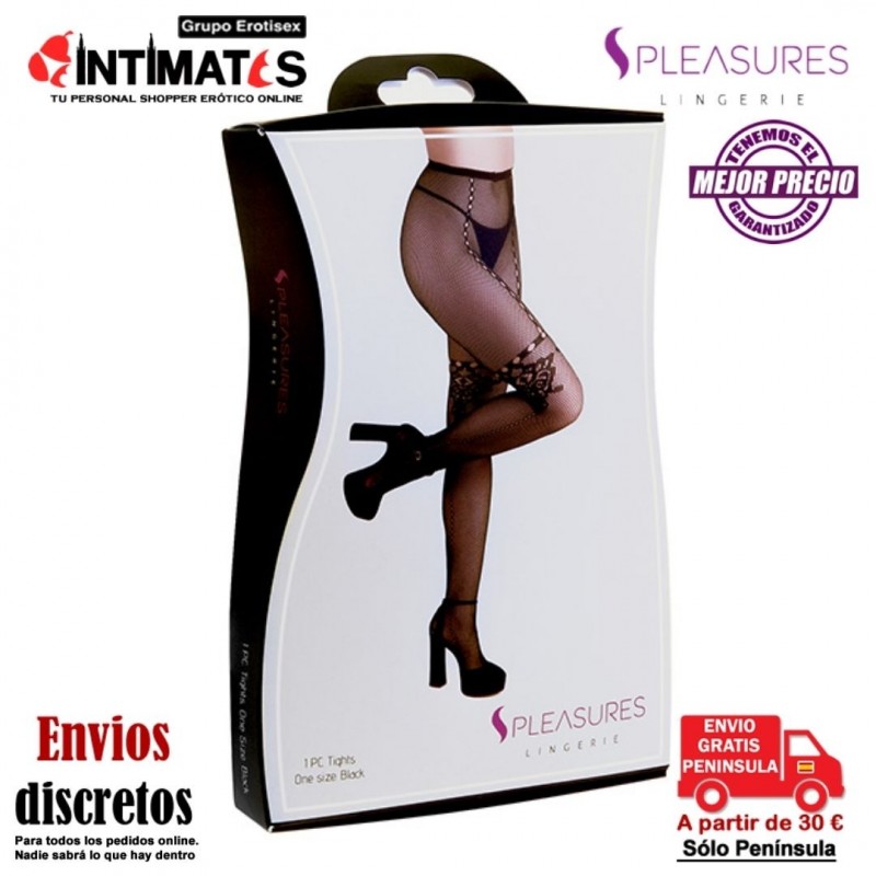 Panty de color negro que combina red pequeña con zonas opacas y otros tamaños de aberturas, consiguiendo así visualmente una explosión de estampaciones muy originales.