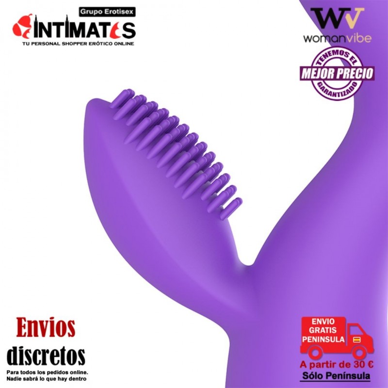 Dispone de dos dos motores, uno en su cabezal y otro en el estimulador de clítoris, que además este tiene puntas en relieve de silicona que transmiten mayor fuerza a la vibración.
