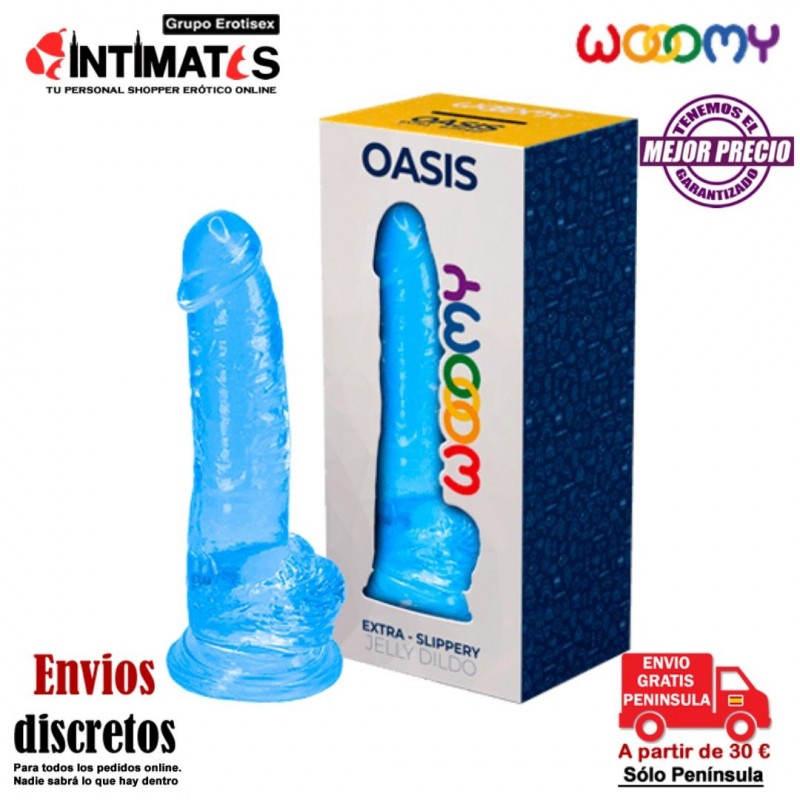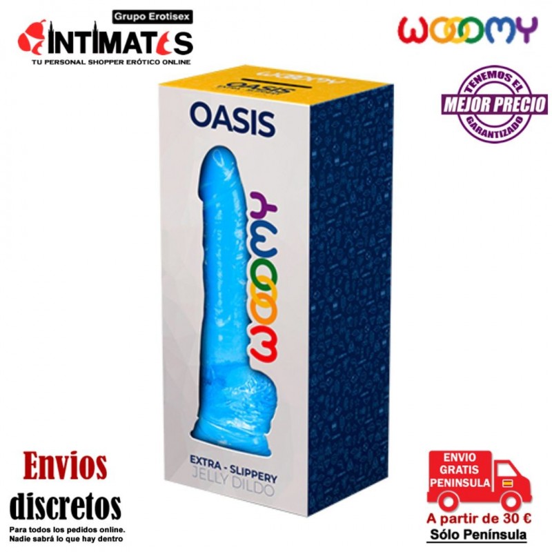 El consolador Oasis de la marca Wooomy es un juguete sexual de generosas dimensiones (20,6 x 4,5 cm), en material Jelly suave y extra-resbaladizo que satisfará a los amantes de los consoladores fornidos.