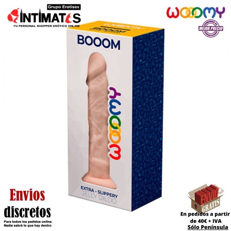 La marca Woomy presenta Booom, un consolador recto y realista, en Jelly (TPE), con venas elevadas y un glande bien diseñado, ideal tanto para la penetración vaginal como anal.