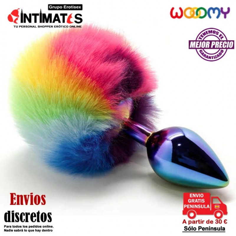 Tanto un juguete sexual anal, una joya traviesa como un accesorio de juego BDSM, el plug Filippi Fluffy Raimbow de tamaño grande de Wooomy es un juguete íntimo particularmente original y sexy con sus colores amigables LGBTQ+ y su pompón de piel sintética adherido a su extremo.