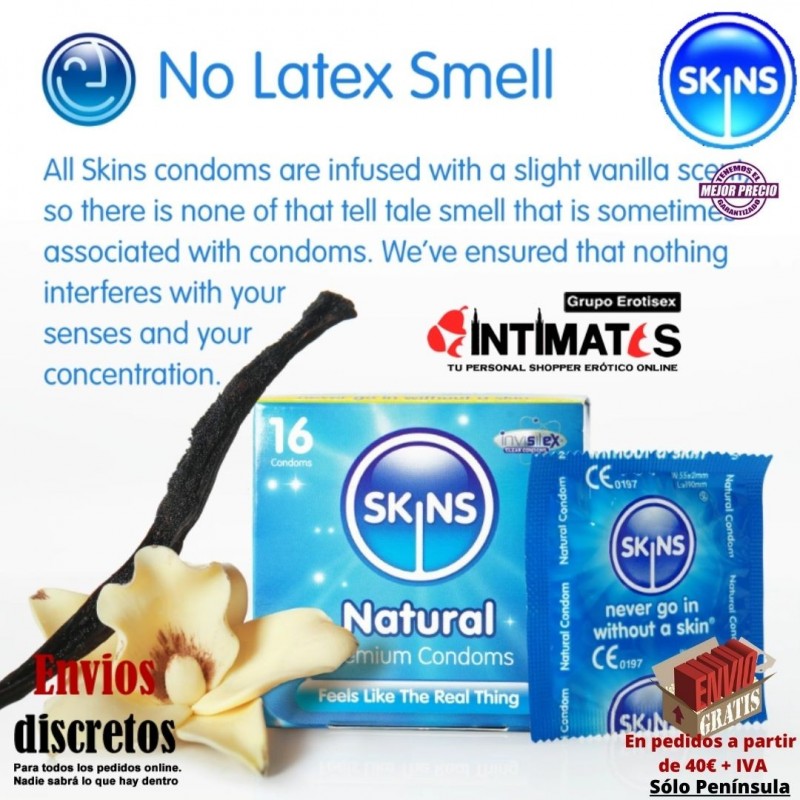 Usando solo látex de primera calidad e infundido con el ligero aroma de vainilla, los condones Skins Natural.