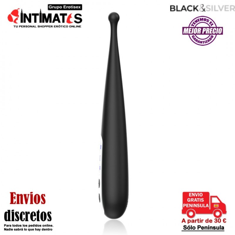 El vibrador Kenneth cuenta con una punta redondeada vibradora que estimula todos tus puntos calientes con una precisión milimétrica: labios, clítoris, pezones o perineo. El pulsing clitorial de Black&Silver estimula todas tus zonas erógenas con vibraciones circulantes.