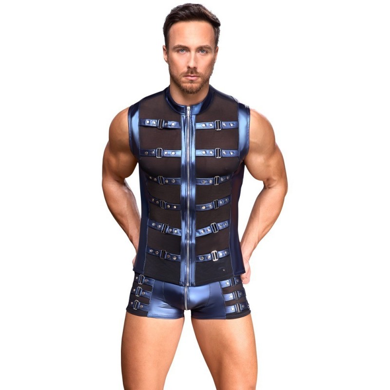 Los pantalones cortos esbeltos y destacados de NEK tienen un cierre de cremallera sobre el bolsillo acolchado. Los pantalones cortos están hechos de material mate azul metálico y tienen tirantes con tachuelas a ambos lados.