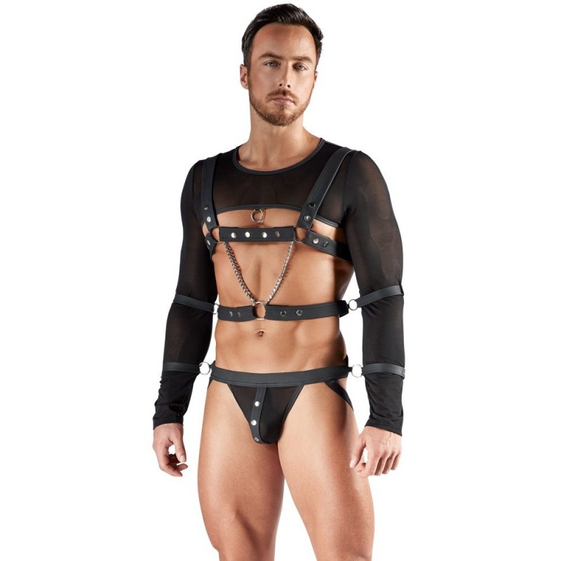 El crop top de pecho abierto y el jock de espalda abierta están fabricados con un suave tejido de malla elástica y también tienen detalles decorativos de aspecto mate. El top tiene mangas largas y una anilla en la parte delantera. El suspensorio tiene una hilera de botones a presión en la bolsa. El arnés tiene correas ajustables de aspecto mate (botones de presión), cadenas y anillas.